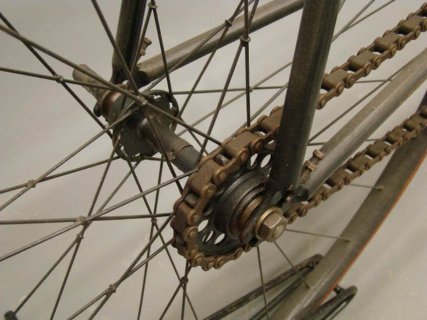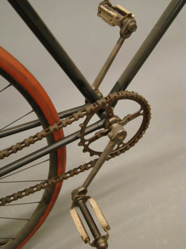 In recent years, two of those bikes were sold at the Copake auction in New York. The one you see in the pictures is a very complete and original example. It features the (then new) Columbia detachable chainwheel and a lot of nice details. Brake is missing. I guess originally pneumatic tires were fitted - now it has cushion or solid tires.